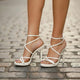 Il design con applicazioni gioiello brillanti valorizza il piede, mentre il plateau anteriore riduce l’inclinazione del piede rendendo il tacco più stabile e comodo da indossare per ore.